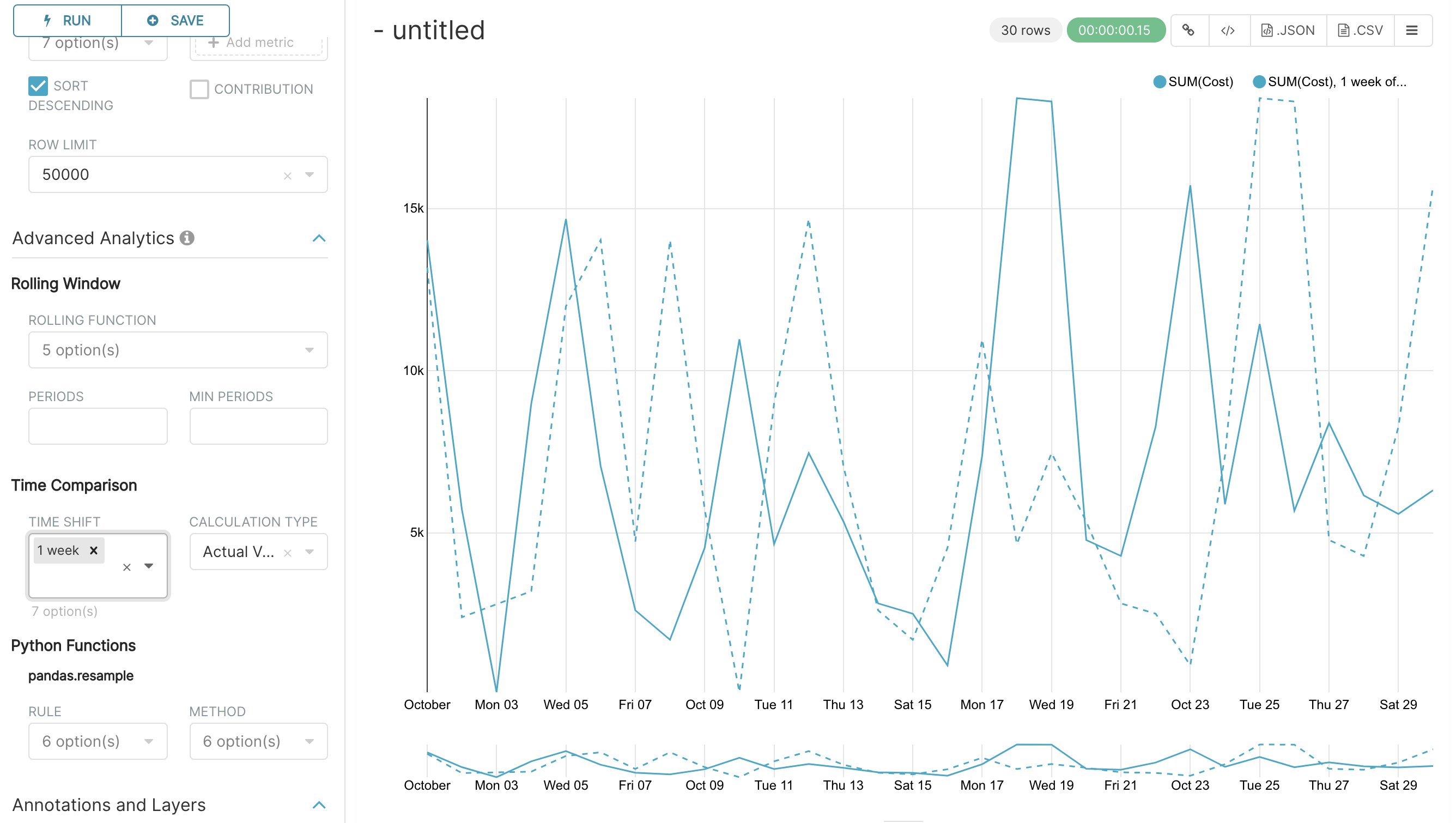 Next, in the Time Comparison subsection of Advanced Analytics, enter the Time Shift by typing in “minus 1 week” (note this box accepts input in natural language). Run Query to see the new chart, which has an additional series with the same values, shifted a week back in time.